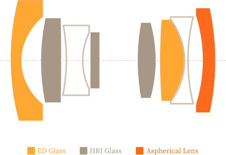 Układ optyczny: 8 elementów w 6 grupach, z 1 soczewką asferyczną (ASPH), 2 elementami ED oraz 3 elementami o wysokim współczynniku załamania (HRI), zaprojektowanymi tak, by ograniczyć aberrację chromatyczną i zniekształcenia przy zachowaniu wysokiej rozdzielczości.